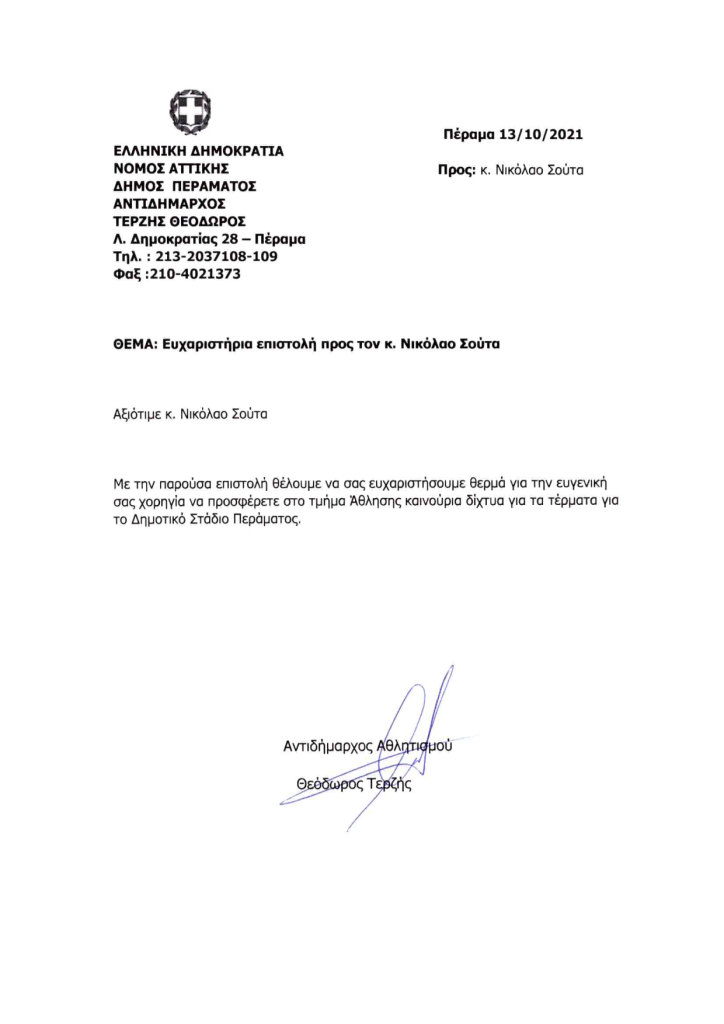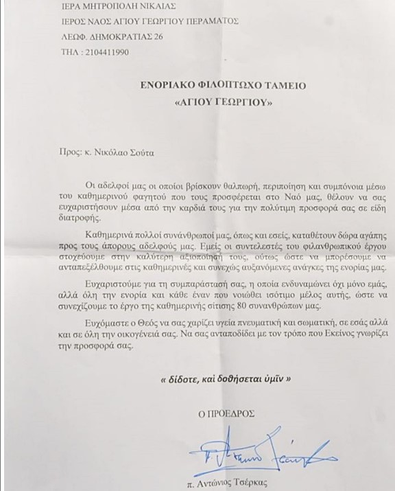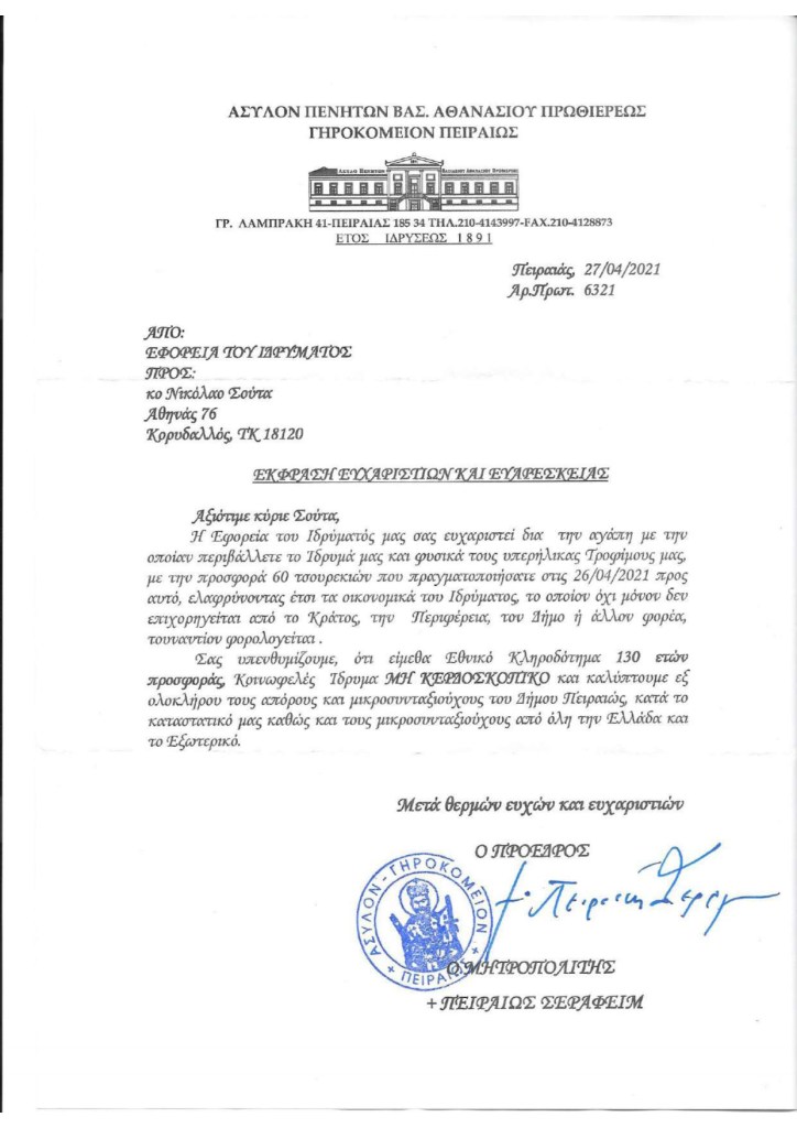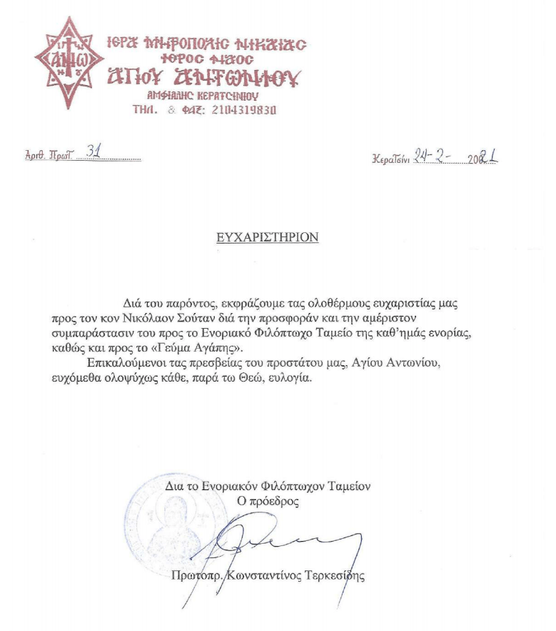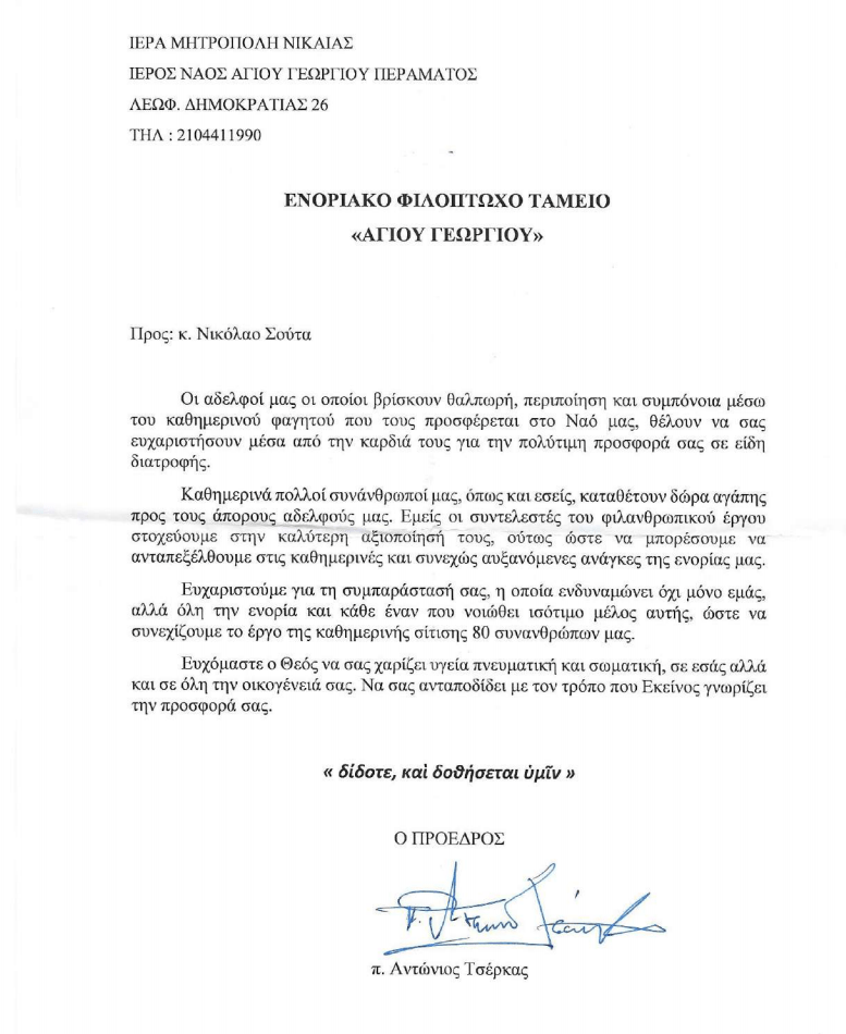 Για την ευγενική του προσφορά, ο Νικόλαος Σούτας έλαβε τις παρακάτω ευχαριστήριες επιστολές: